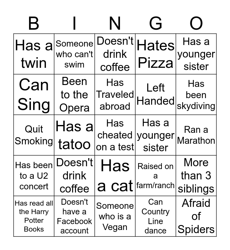 This bingo card has 25 words: Doesn't drink coffee, Someone who is a Vegan, Has Traveled abroad, Has read all the Harry Potter Books, Has a younger sister, Has a twin, Can Sing, Someone who can't swim, Has a younger sister, Has a cat, Left Handed, Quit Smoking, Raised on a farm/ranch, More than 3 siblings, Been to the Opera, Afraid of Spiders, Ran a Marathon, Doesn't drink coffee, Has been skydiving, Has a tatoo, Has cheated on a test, Doesn't have a Facebook account, Has been to a U2 concert, Hates Pizza and Can Country Line dance.