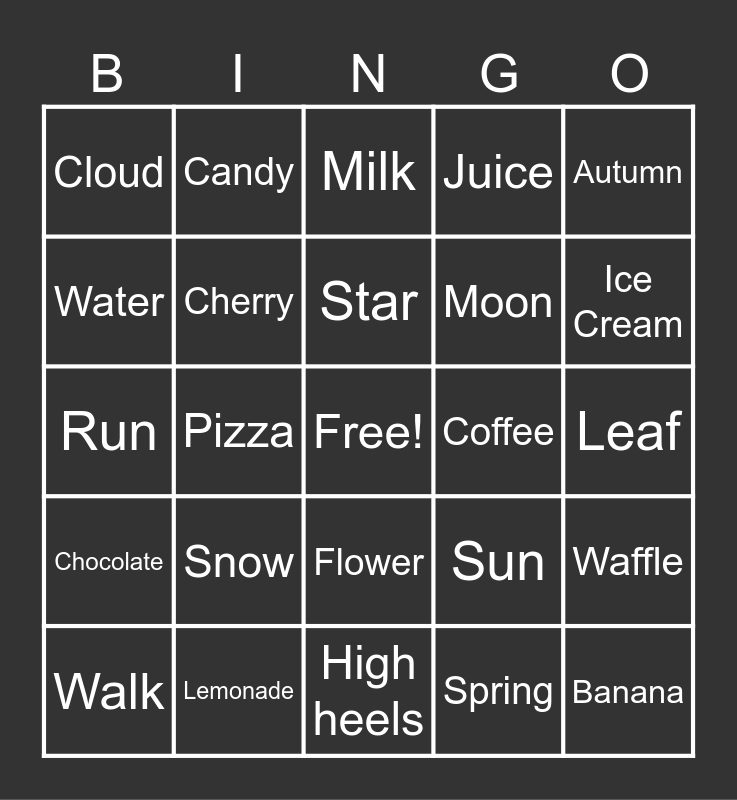 This bingo card has a free space and 24 words: Snow, Lemonade, Star, Walk, Autumn, Cloud, Water, Candy, Coffee, Flower, Moon, Run, Sun, Waffle, Cherry, Spring, Leaf, Milk, Ice Cream, Pizza, Banana, Chocolate, Juice and High heels.