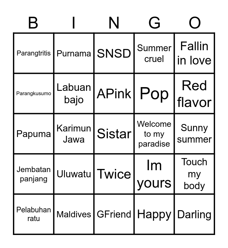 This bingo card has a free space and 24 words: Pelabuhan ratu, Uluwatu, APink, Happy, Fallin in love, Parangtritis, Purnama, SNSD, Welcome to my paradise, Sunny summer, Papuma, Labuan bajo, Im yours, Touch my body, Parangkusumo, Maldives, GFriend, Summer cruel, Red flavor, Jembatan panjang, Karimun Jawa, Twice, Pop and Darling.