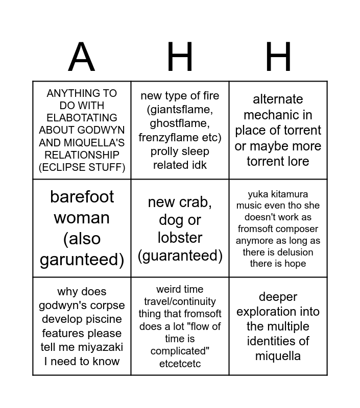 This bingo card has 9 words: why does godwyn's corpse develop piscine features please tell me miyazaki I need to know, alternate mechanic in place of torrent or maybe more torrent lore, new type of fire (giantsflame, ghostflame, frenzyflame etc) prolly sleep related idk, barefoot woman (also garunteed), ANYTHING TO DO WITH ELABOTATING ABOUT GODWYN AND MIQUELLA'S RELATIONSHIP (ECLIPSE STUFF), yuka kitamura music even tho she doesn't work as fromsoft composer anymore as long as there is delusion there is hope, new crab, dog or lobster (guaranteed), deeper exploration into the multiple identities of miquella and weird time travel/continuity thing that fromsoft does a lot "flow of time is complicated" etcetcetc.