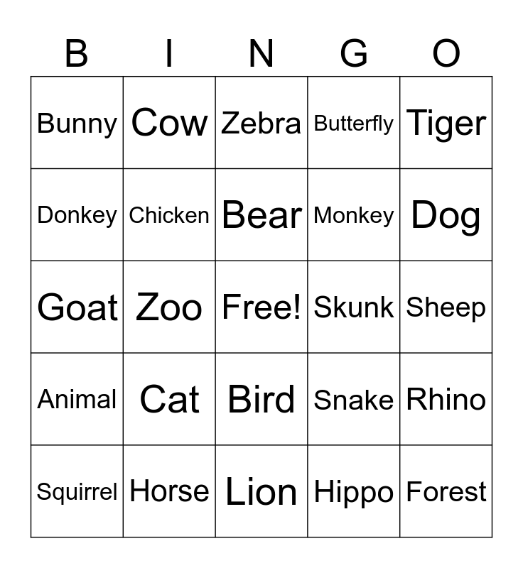 This bingo card has a free space and 24 words: Cat, Horse, Bear, Squirrel, Tiger, Bunny, Donkey, Cow, Skunk, Bird, Monkey, Goat, Snake, Rhino, Chicken, Hippo, Sheep, Zebra, Dog, Zoo, Forest, Animal, Butterfly and Lion.