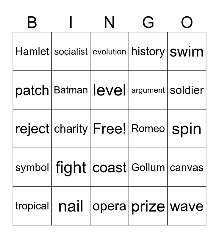 This bingo card has a free space and 24 words: fight, nail, level, tropical, swim, Hamlet, patch, socialist, Romeo, coast, argument, reject, Gollum, canvas, Batman, prize, spin, evolution, soldier, charity, wave, symbol, history and opera.