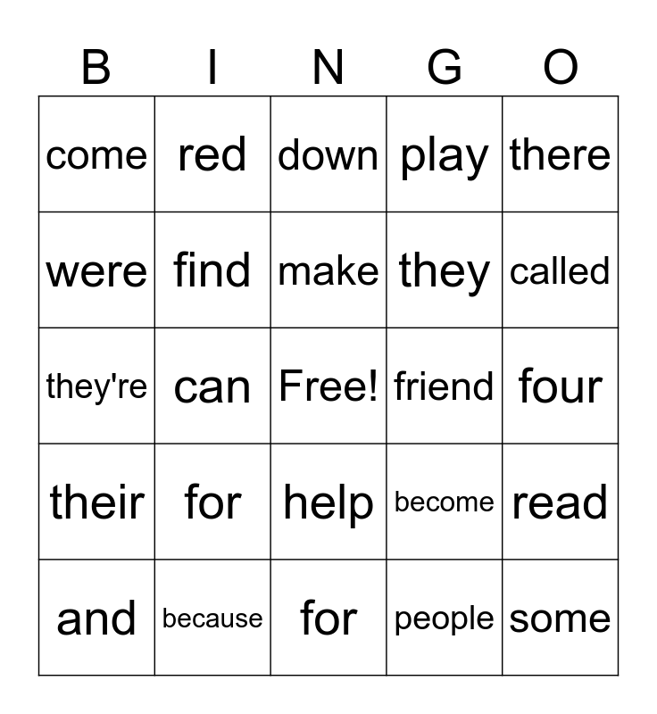 This bingo card has a free space and 29 words: and, away, can, blue, come, down, find, for, friend, because, four, some, for, people, called, funny, help, their, there, they're, become, she, they, were, play, red, read, make and said.