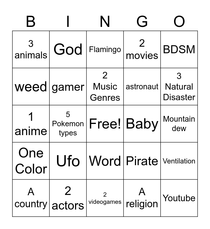 This bingo card has a free space and 24 words: Ufo, 2 actors, 2 Music Genres, A country, BDSM, 3 animals, weed, God, Baby, Word, astronaut, 1 anime, Pirate, Ventilation, gamer, A religion, Mountain dew, Flamingo, 3 Natural Disaster, 5 Pokemon types, Youtube, One Color, 2 movies and 2 videogames.