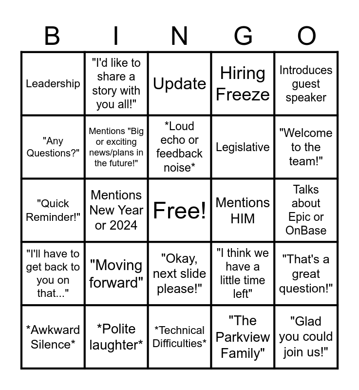 This bingo card has a free space and 24 words: *Awkward Silence*, "Moving forward", *Loud echo or feedback noise*, "The Parkview Family", Introduces guest speaker, Leadership, "I'd like to share a story with you all!", Update, Mentions HIM, Talks about Epic or OnBase, "Quick Reminder!", Mentions "Big or exciting news/plans in the future!", "I think we have a little time left", "That's a great question!", "Any Questions?", *Polite laughter*, *Technical Difficulties*, Hiring Freeze, "Welcome to the team!", "I'll have to get back to you on that...", Mentions New Year or 2024, "Okay, next slide please!", Legislative and "Glad you could join us!".