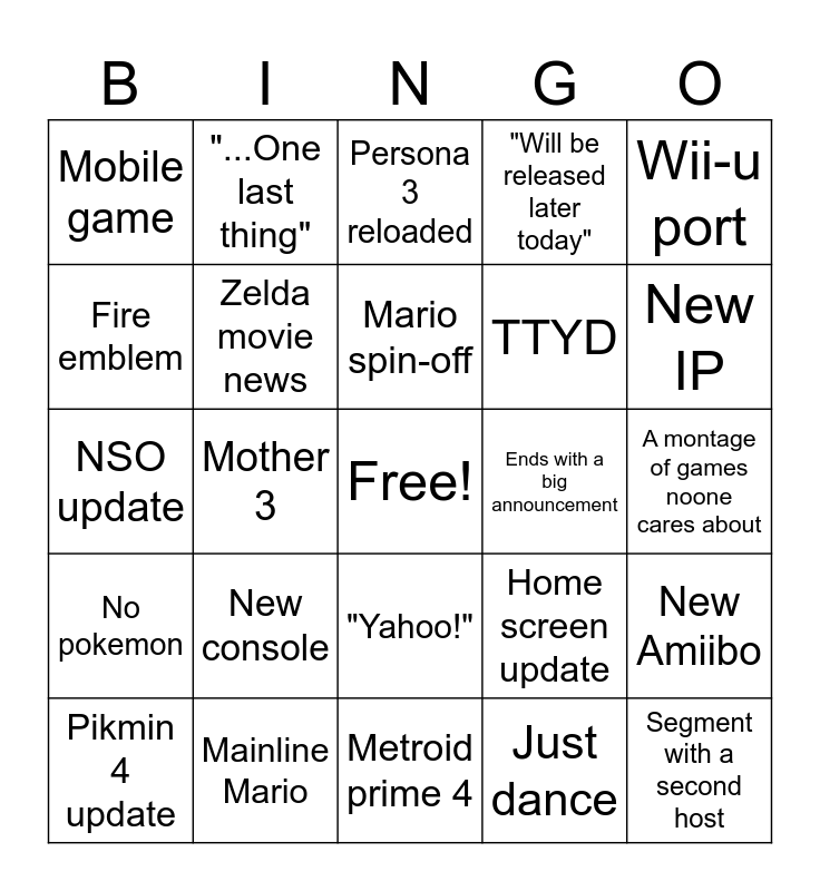 This bingo card has a free space and 24 words: New console, Mainline Mario, Mario spin-off, Pikmin 4 update, Wii-u port, Mobile game, Fire emblem, "...One last thing", Ends with a big announcement, "Yahoo!", TTYD, NSO update, Home screen update, New Amiibo, Zelda movie news, Just dance, A montage of games noone cares about, Persona 3 reloaded, New IP, Mother 3, Segment with a second host, No pokemon, "Will be released later today" and Metroid prime 4.