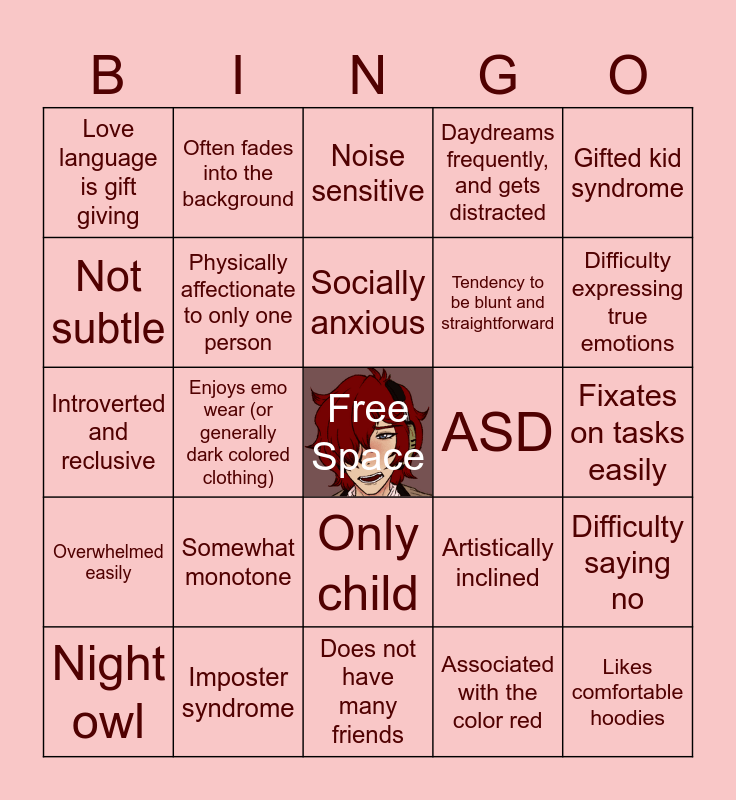 This bingo card has a free space and 24 words: Somewhat monotone, Imposter syndrome, Socially anxious, Night owl, Gifted kid syndrome, Love language is gift giving, Not subtle, Often fades into the background, ASD, Only child, Tendency to be blunt and straightforward, Introverted and reclusive, Artistically inclined, Difficulty saying no, Physically affectionate to only one person, Associated with the color red, Fixates on tasks easily, Noise sensitive, Difficulty expressing true emotions, Enjoys emo wear (or generally dark colored clothing), Likes comfortable hoodies, Overwhelmed easily, Daydreams frequently, and gets distracted and Does not have many friends.