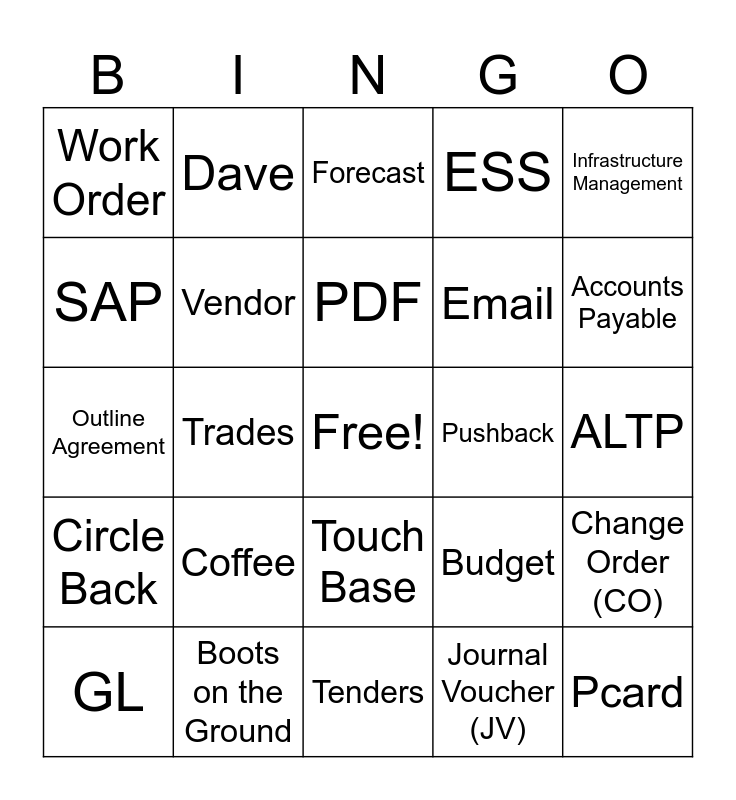 This bingo card has a free space and 57 words: Award Letter, GL, CC, Work Order, Tenders, Invoice, Vendor, Year End, Email, Vacation, ESS, Signing Authority, Asset Management, PWSP, TCA, Real Estate, Infrastructure Management, Trades, Frustrated/Frustration, Pcard, Pushback, Fiscal, Budget, Forecast, Approvals, PDF, Attachment, Digital Signature, Accounts Payable, Rebills, Gas Receipts, Brainstorm, Burnside, Scanning, ALTP, SAP, Files, Outline Agreement, Earl, Circle Back, Dave, Touch Base, Lunch, Align, Tea, Utilize, Coffee, Boots on the Ground, Schedule, Procurement, Process, Journal Voucher (JV), Template, Purchase Order (PO), Expenses, Change Order (CO) and Bible Hill.