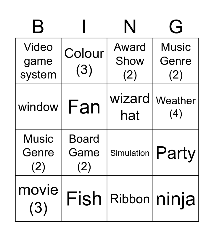 This bingo card has 16 words: Fish, Party, Award Show (2), Video game system, Music Genre (2), Colour (3), Simulation, Ribbon, window, Fan, movie (3), Music Genre (2), Board Game (2), Weather (4), wizard hat and ninja.