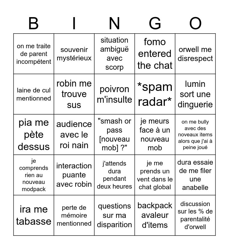 This bingo card has a free space and 24 words: interaction puante avec robin, perte de mémoire mentionned, poivron m'insulte, ira me tabasse, orwell me disrespect, on me traite de parent incompétent, laine de cul mentionned, souvenir mystérieux, je meurs face à un nouveau mob, j'attends dura pendant deux heures, *spam radar*, pia me pète dessus, je me prends un vent dans le chat global, dura essaie de me filer une anabelle, robin me trouve sus, backpack avaleur d'items, on me bully avec des noveaux items alors que j'ai à peine joué, situation ambiguë avec scorp, lumin sort une dinguerie, audience avec le roi nain, discussion sur les % de parentalité d'orwell, je comprends rien au nouveau modpack, fomo entered the chat and questions sur ma disparition.