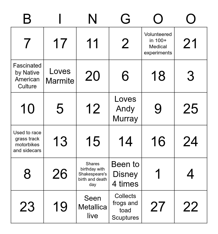 This bingo card has 36 words: Been to Disney 4 times, Shares birthday with Shakespeare's birth and death day, Collects frogs and toad Scuptures, Fascinated by Native American Culture, Used to race grass track motorbikes and sidecars, Loves Andy Murray, Loves Marmite, Seen Metallica live, Volunteered in 100+ Medical experiments, 1, 3, 2, 4, 5, 6, 7, 8, 9, 10, 11, 12, 13, 14, 15, 16, 17, 18, 19, 20, 21, 22, 23, 24, 25, 26 and 27.