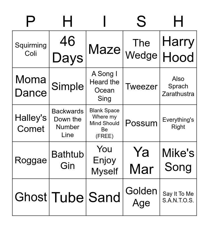 This bingo card has a free space and 24 words: Bathtub Gin, Tube, A Song I Heard the Ocean Sing, Ghost, Harry Hood, Squirming Coli, Moma Dance, 46 Days, Possum, You Enjoy Myself, Tweezer, Halley's Comet, Ya Mar, Mike's Song, Simple, Golden Age, Everything's Right, Maze, Also Sprach Zarathustra, Backwards Down the Number Line, Say It To Me S.A.N.T.O.S., Roggae, The Wedge and Sand.