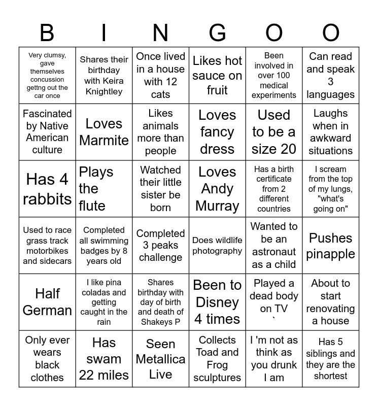 This bingo card has 36 words: Been to Disney 4 times, Shares birthday with day of birth and death of Shakeys P, Collects Toad and Frog sculptures, Fascinated by Native American culture, Used to race grass track motorbikes and sidecars, Loves Andy Murray, Loves Marmite, Seen Metallica Live, Been involved in over 100 medical experiments, Played a dead body on TV `, Laughs when in awkward situations, Likes hot sauce on fruit, About to start renovating a house, Plays the flute, Loves fancy dress, Very clumsy, gave themselves concussion gettng out the car once, Half German, Has a birth certificate from 2 different countries, Has 4 rabbits, Once lived in a house with 12 cats, Watched their little sister be born, Completed all swimming badges by 8 years old, Does wildlife photography, Completed 3 peaks challenge, Wanted to be an astronaut as a child, Shares their birthday with Keira Knightley, Used to be a size 20, Has swam 22 miles, Likes animals more than people, Can read and speak 3 languages, Has 5 siblings and they are the shortest, Only ever wears black clothes, Pushes pinapple, I scream from the top of my lungs, "what's going on", I like pina coladas and getting caught in the rain and I 'm not as think as you drunk I am.