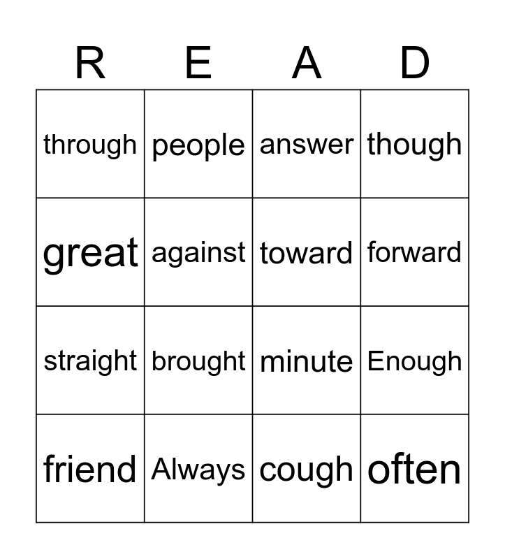 This bingo card has 16 words: Always, Enough, answer, through, straight, people, minute, cough, great, against, friend, though, brought, forward, toward and often.