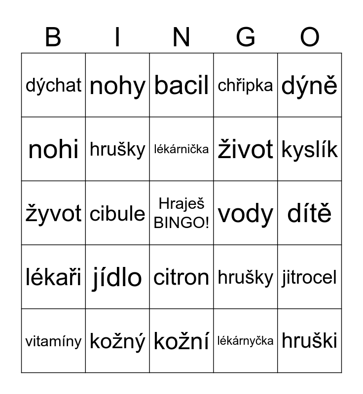 This bingo card has a free space and 24 words: jídlo, kožný, lékárnička, vitamíny, dýně, dýchat, nohi, nohy, vody, citron, život, žyvot, hrušky, jitrocel, hrušky, lékárnyčka, dítě, bacil, kyslík, cibule, hruški, lékaři, chřipka and kožní.