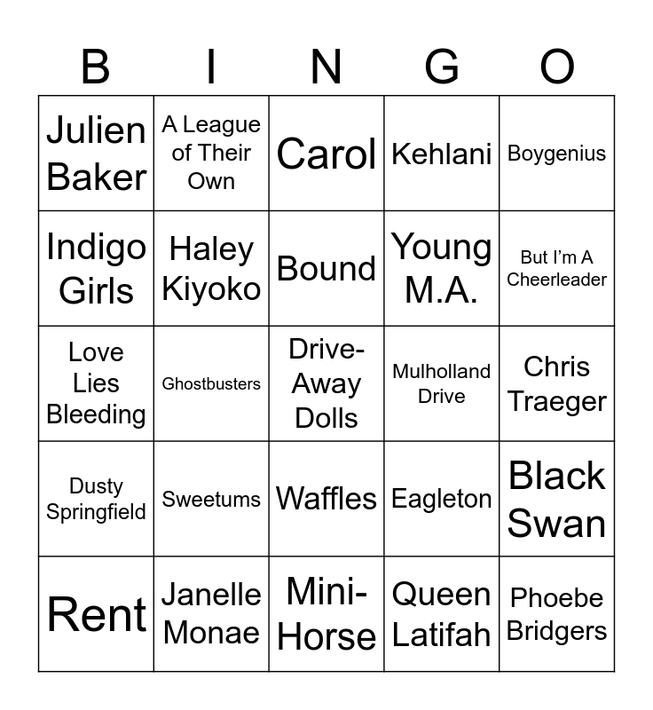 This bingo card has a free space and 59 words: Melissa Ethridge, Janelle Monae, K.d. Lang, Dusty Springfield, Queen Latifah, Tracy Chapman, Haley Kiyoko, Ma Rainey, Young M.A., Tegan and Sara, Kehlani, Brandi Carlile, Indigo Girls, Brandy Clark, St. Vincent, Julien Baker, Phoebe Bridgers, Boygenius, Portrait of a Lady on Fire, Bound, Mulholland Drive, Carol, Rent, Black Swan, Charlie’s Angels, The Runaways, Blue is the Warmest Color, The Favourite, But I’m A Cheerleader, Bend It Like Beckham, Thelma & Louise, Whip It!, Jennifer’s Body, The Craft, A League of Their Own, Hustlers, Scooby-Doo, Ghostbusters, Thor: Ragnarok, Love Lies Bleeding, Bodies, Bodies, Bodies, Sweetums, Chris Traeger, Charles Mulligan’s Steakhouse, Roomba, Indiana, Mouse Rat, Burt Macklin, Waffles, Mini-Horse, Mona Lisa, Soda, Tammy, Cones of Dunshire, Duke Silver, Eagleton, Galentine’s Day, Champion and Gryzzl.