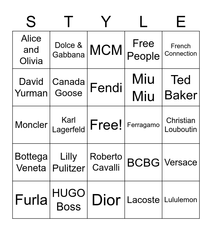 This bingo card has a free space and 73 words: Alexander McQueen, Armani, Alice and Olivia, AllSaints, Burberry, Balmain, Bottega Veneta, Barbour, BCBG, Chanel, Cartier, Chloe, Canada Goose, Christian Louboutin, Coach, Dolce & Gabbana, Dior, David Yurman, Effy, Ferragamo, Fendi, Free People, French Connection, Frye, Furla, Givenchy, Gucci, Golden Goose, Hermès, Hudson, HUGO Boss, Jimmy Choo, John Hardy, Kate Spade, Karl Lagerfeld, Kendra Scott, Kurt Geiger, Lagos, Lululemon, Louis Vuitton, Lacoste, Lilly Pulitzer, Love Moschino, Madewell, Marc Jacob, Miu Miu, MCM, Manolo Blahnik, Michael Kors, Moncler, Omega, Off-White, Prada, Paige, Rolex, Ralph Lauren, Robert Graham, Roberto Cavalli, Stuart Weitzman, Swarovski, Tom Ford, Tiffany & Co., Tory Burch, Ted Baker, Theory, Tommy Bahama, Ugg, Valentino, Versace, Vineyard Vines, Yves Saint Laurent, Zac Posen and Zimmermann.