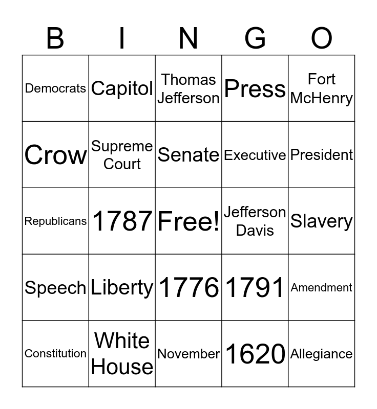 This bingo card has a free space and 24 words: Liberty, White House, Senate, Constitution, Fort McHenry, Democrats, Crow, Capitol, Jefferson Davis, 1776, Executive, Republicans, 1791, Amendment, Supreme Court, 1620, Slavery, Thomas Jefferson, President, 1787, Allegiance, Speech, Press and November.