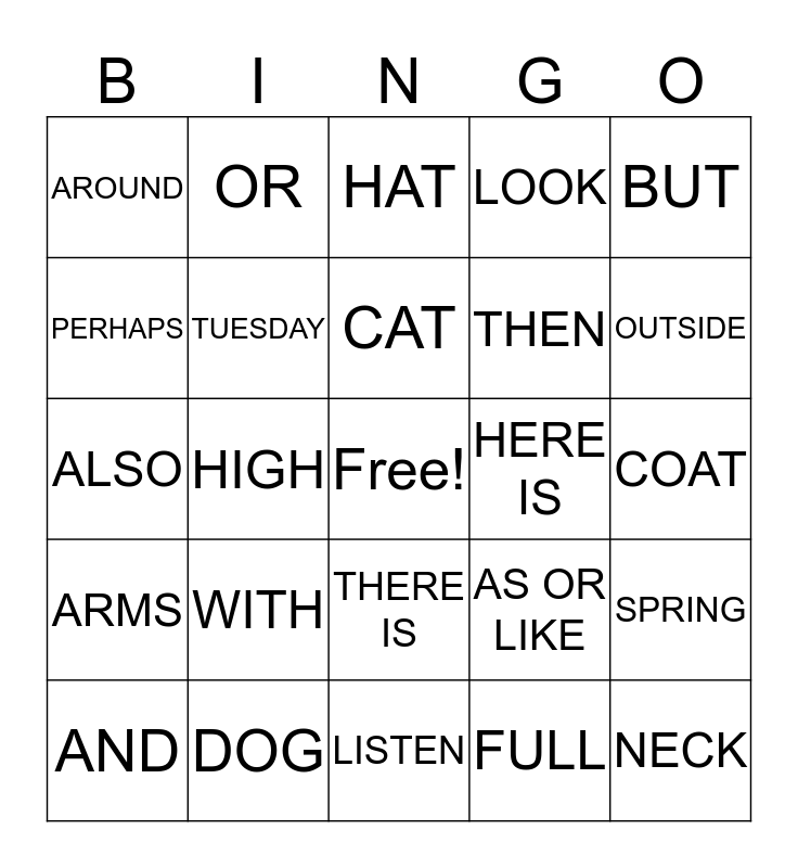 This bingo card has a free space and 24 words: WITH, DOG, CAT, AND, BUT, AROUND, PERHAPS, OR, HERE IS, THERE IS, THEN, ALSO, AS OR LIKE, SPRING, TUESDAY, FULL, COAT, HAT, OUTSIDE, HIGH, NECK, ARMS, LOOK and LISTEN.