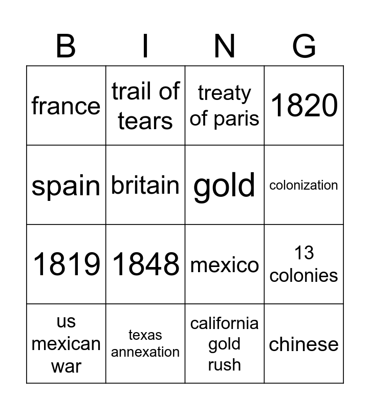 This bingo card has 16 words: texas annexation, 13 colonies, treaty of paris, france, 1819, trail of tears, mexico, california gold rush, spain, britain, us mexican war, 1820, 1848, colonization, gold and chinese.
