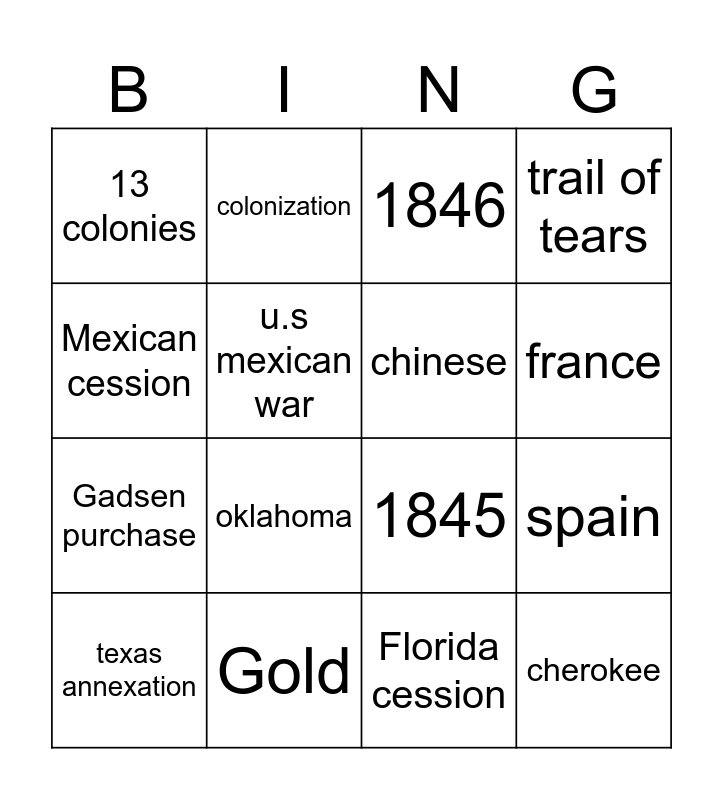 This bingo card has 16 words: Gold, spain, 1846, 13 colonies, Gadsen purchase, colonization, 1845, Florida cession, Mexican cession, u.s mexican war, texas annexation, trail of tears, oklahoma, france, chinese and cherokee.