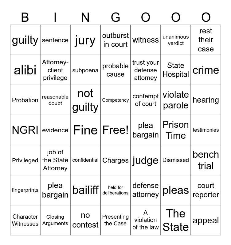 This bingo card has a free space and 48 words: Privileged, evidence, no contest, Charges, trust your defense attorney, Prison Time, rest their case, Character Witnesses, reasonable doubt, Fine, outburst in court, witness, violate parole, hearing, NGRI, plea bargain, jury, Competency, defense attorney, unanimous verdict, crime, alibi, sentence, subpoena, A violation of the law, State Hospital, testimonies, fingerprints, job of the State Attorney, not guilty, held for deliberations, contempt of court, pleas, court reporter, guilty, Closing Arguments, confidential, Presenting the Case, plea bargain, The State, bench trial, Probation, Attorney-client privilege, bailiff, probable cause, judge, Dismissed and appeal.