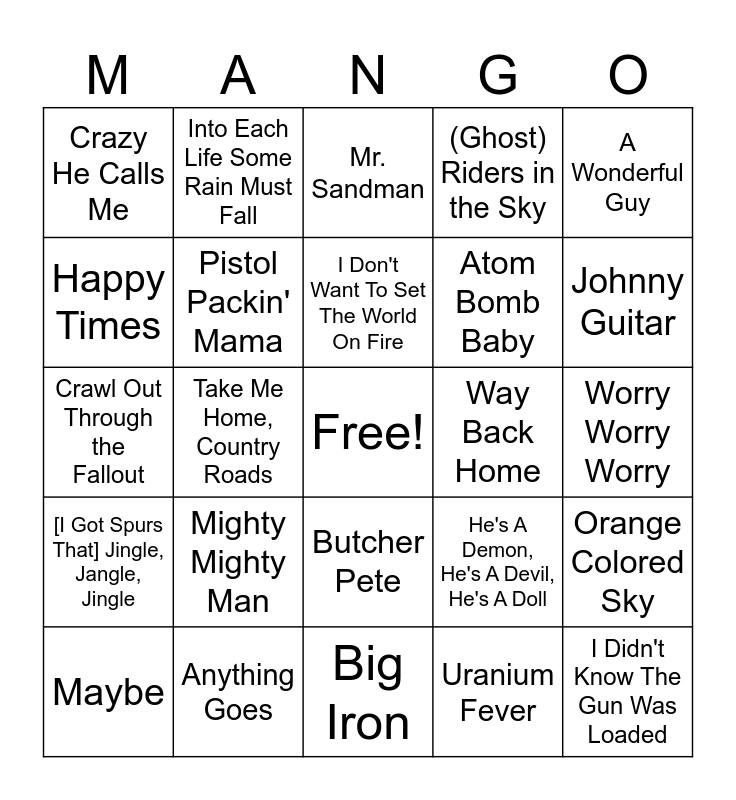 This bingo card has a free space and 24 words: Mighty Mighty Man, Anything Goes, I Don't Want To Set The World On Fire, Maybe, A Wonderful Guy, Crazy He Calls Me, Happy Times, Into Each Life Some Rain Must Fall, Way Back Home, Butcher Pete, Atom Bomb Baby, Crawl Out Through the Fallout, He's A Demon, He's A Devil, He's A Doll, Orange Colored Sky, Pistol Packin' Mama, Uranium Fever, Worry Worry Worry, Mr. Sandman, Johnny Guitar, Take Me Home, Country Roads, I Didn't Know The Gun Was Loaded, [I Got Spurs That] Jingle, Jangle, Jingle, (Ghost) Riders in the Sky and Big Iron.