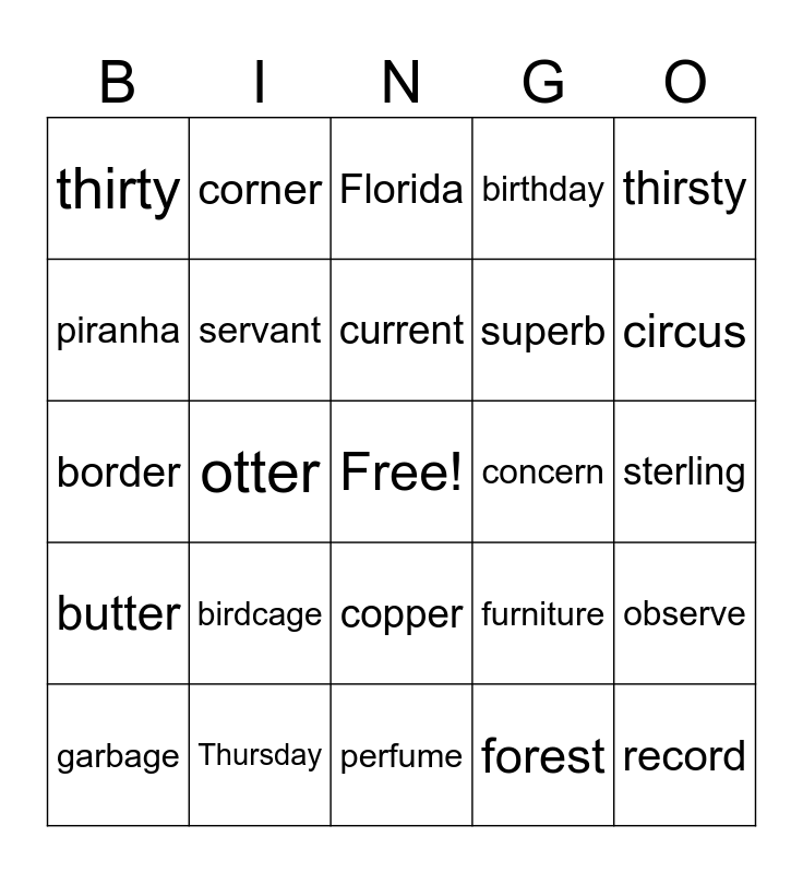 This bingo card has a free space and 34 words: racecar, forlorn, starved, larva, sterling, piranha, servant, perfume, superb, record, border, corner, forest, market, butter, otter, copper, concern, observe, garbage, Thursday, turkey, birthday, circus, nursery, birdcage, Florida, turtle, thirsty, thirty, desert, current, furniture and army.