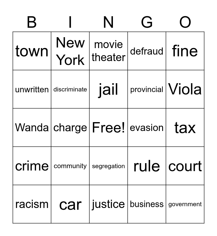 This bingo card has a free space and 39 words: prejudge, prejudice, discrimination, discriminate, racism, segregation, jail, cell, fine, crime, charge, defraud, government, tax, evasion, community, city, town, law, rule, unwritten, justice, provincial, Viola, Desmond, Nova Scotia, New Glasgow, Halifax, Montreal, New York, salon, products, movie theater, car, business, Africville, court, Wanda and hairdresser.