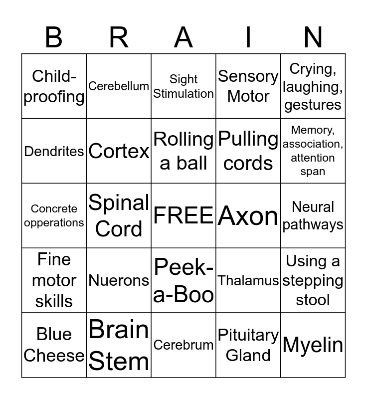 This bingo card has a free space and 24 words: Nuerons, Brain Stem, Rolling a ball, Blue Cheese, Crying, laughing, gestures, Child-proofing, Dendrites, Cerebellum, Axon, Peek-a-Boo, Pulling cords, Concrete opperations, Thalamus, Using a stepping stool, Cortex, Pituitary Gland, Neural pathways, Sight Stimulation, Memory, association, attention span, Spinal Cord, Myelin, Fine motor skills, Sensory Motor and Cerebrum.