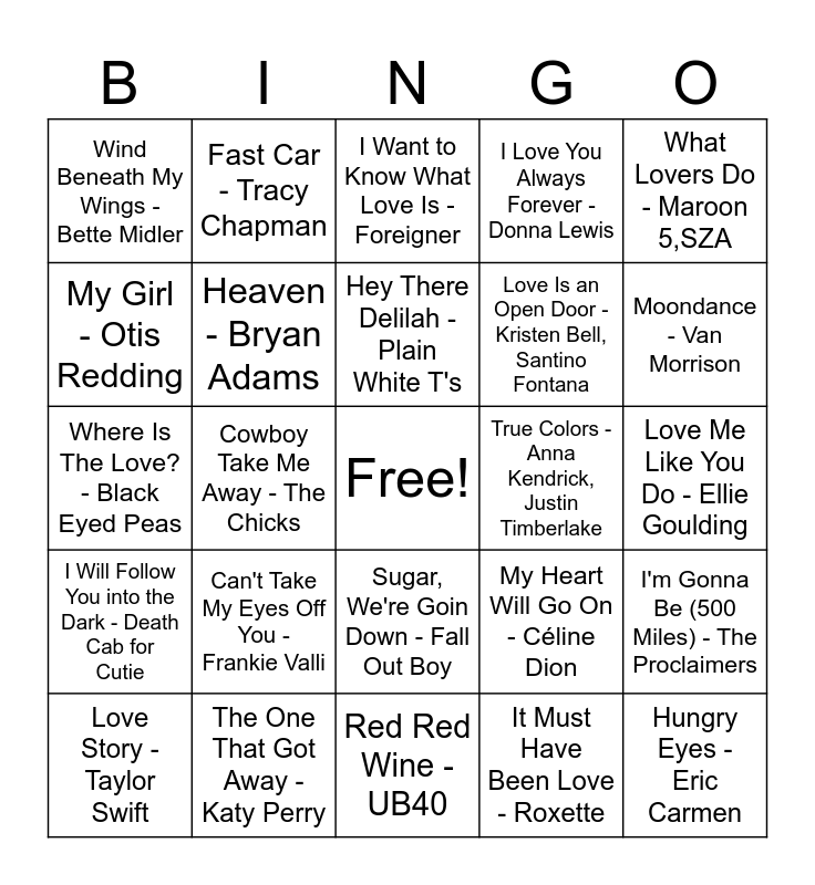 This bingo card has a free space and 78 words: Just the Way You Are - Bruno Mars, Killing Me Softly with His Song, I Want to Know What Love Is - Foreigner, You're Beautiful - James Blunt, Kiss from a Rose - Seal, Love Hurts - Gram Parsons, You're the Inspiration - Chicago, Perfect, The Boy Is Mine - Brandy,Monica, A Thousand Years - Christina Perri, Baby, I Love Your Way - Big Mountain, Stand by Me - Ben E. King, I Love You Always Forever - Donna Lewis, Wind Beneath My Wings - Bette Midler, I Swear, My Girl - Otis Redding, (You Make Me Feel Like) A Natural Woman - Aretha Franklin, Can't Take My Eyes Off You - Frankie Valli, Valerie - Amy Winehouse, Love Me Like You Do - Ellie Goulding, Let Me Love You, What Lovers Do - Maroon 5,SZA, Where Is The Love? - Black Eyed Peas, Hey There Delilah - Plain White T's, Heaven - Bryan Adams, You're Still The One - Shania Twain, Skinny Love - Birdy, I Got You Babe - Sonny & Cher, I'm a Believer - The Monkees, You Sexy Thing - Hot Chocolate, Moondance - Van Morrison, Save the Last Dance for Me - The Drifters, Red Red Wine - UB40, Red - Taylor Swift, Love Story - Taylor Swift, True Colors - Anna Kendrick, Justin Timberlake, All You Need Is Love - The Beatles, Just Give Me a Reason - P!nk, Nate Ruess, This Will Be (An Everlasting Love) - Natalie Cole, Hungry Eyes - Eric Carmen, Can't Help Falling in Love - Elvis Presley, You Are the Best Thing - Ray LaMontagne, Make You Feel My Love - Adele, Can You Feel The Love Tonight - Elton John, Chasing Cars - Snow Patrol, Fast Car - Tracy Chapman, Love Me Like You Do - Ellie Goulding, I Don't Want to Miss a Thing - Aerosmith, I Wanna Dance with Somebody (Who Loves Me) - Whitney Houston, (Everything I Do) I Do It For You - Bryan Adams, I'm Gonna Be (500 Miles) - The Proclaimers, Cowboy Take Me Away - The Chicks, My Heart Will Go On - Céline Dion, I Will Always Love You - Whitney Houston, Don't Speak - No Doubt, Un-Break My Heart - Toni Braxton, Jane - Barenaked Ladies, The Old Apartment - Barenaked Ladies, Crazy In Love - Beyoncé,JAY-Z, Sugar, We're Goin Down - Fall Out Boy, Love Is an Open Door - Kristen Bell, Santino Fontana, You Can't Hurry Love - The Supremes, Little Talks - Of Monsters and Men, Livin' On A Prayer - Bon Jovi, Shut Up and Dance - WALK THE MOON, Marry You - Bruno Mars, When a Man Loves a Woman - Percy Sledge, Like I'm Gonna Lose You - Meghan Trainor, John Legend, I Will Follow You into the Dark - Death Cab for Cutie, The One That Got Away - Katy Perry, I'm Yours - Jason Mraz, Time After Time, She Will Be Loved - Maroon 5, Haven't Met You Yet - Michael Bublé, It Must Have Been Love - Roxette, Every Breath You Take - The Police, I Just Called To Say I Love You and Tears in Heaven.