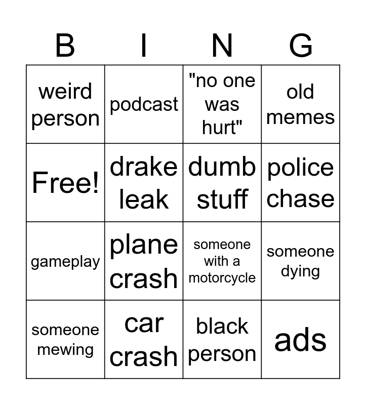 This bingo card has 16 words: car crash, someone dying, "no one was hurt", weird person, gameplay, podcast, someone with a motorcycle, black person, Free!, drake leak, someone mewing, old memes, plane crash, police chase, dumb stuff and ads.