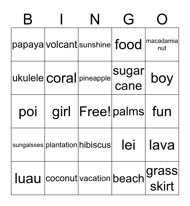 This bingo card has a free space and 24 words: plantation, coconut, pineapple, luau, macadamia nut, papaya, ukulele, volcant, palms, hibiscus, sugar cane, poi, lei, lava, coral, beach, fun, sunshine, boy, girl, grass skirt, sungalsses, food and vacation.