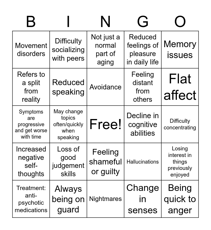 This bingo card has a free space and 34 words: Flashbacks, Change in senses, Becoming easily confused, Poor executive functioning, Increased negative self-thoughts, Reduced speaking, Memory issues, Treatment: anti-psychotic medications, Difficulty socializing with peers, Engaging in risky behavior, Avoidance, Not just a normal part of aging, Getting lost in areas they are familiar with, Thought disorders, Decline in cognitive abilities, Flat affect, Always being on guard, Symptoms are progressive and get worse with time, Loss of good judgement skills, Hallucinations, Feeling shameful or guilty, Difficulty sleeping, Movement disorders, Difficulty concentrating, Nightmares, Being quick to anger, Reduced feelings of pleasure in daily life, Difficulty with logic or problem solving, Feeling distant from others, Refers to a split from reality, Does not increase violence or aggression, May change topics often/quickly when speaking, Losing interest in things previously enjoyed and Alzheimer's falls under this umbrella term.
