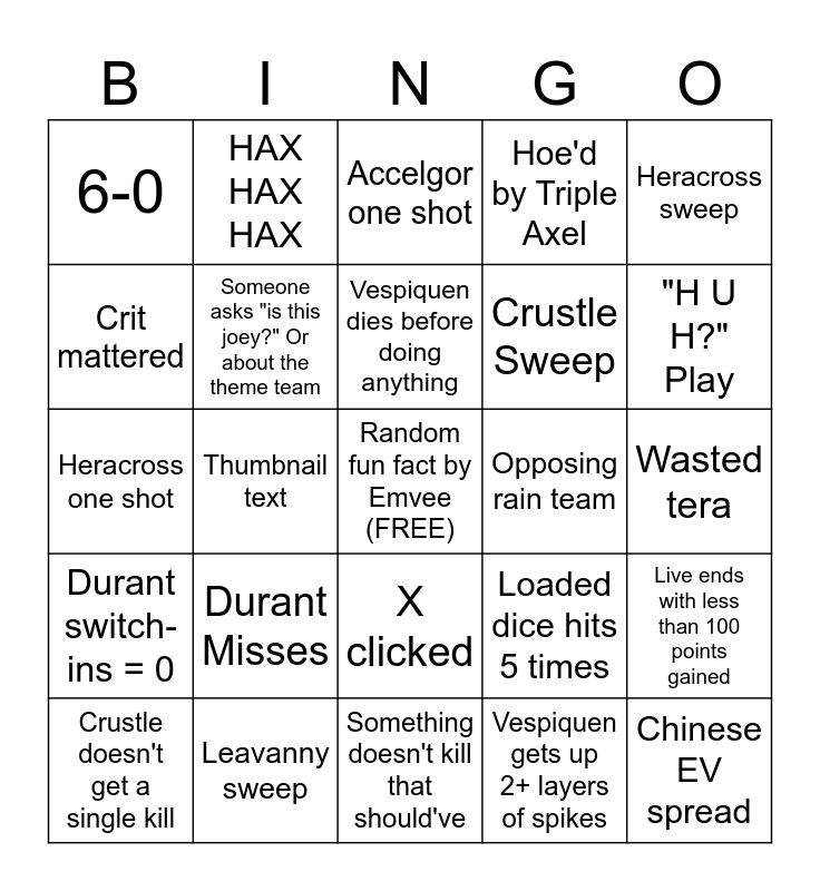 This bingo card has a free space and 24 words: Durant Misses, Leavanny sweep, Vespiquen dies before doing anything, Crustle doesn't get a single kill, Heracross sweep, 6-0, Crit mattered, HAX HAX HAX, Opposing rain team, X clicked, Crustle Sweep, Heracross one shot, Loaded dice hits 5 times, Live ends with less than 100 points gained, Someone asks "is this joey?" Or about the theme team, Vespiquen gets up 2+ layers of spikes, Wasted tera, Accelgor one shot, "H U H?" Play, Thumbnail text, Chinese EV spread, Durant switch-ins = 0, Hoe'd by Triple Axel and Something doesn't kill that should've.