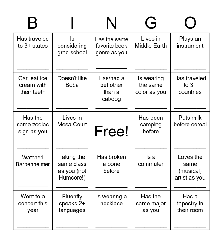 This bingo card has a free space and 24 words: Taking the same class as you (not Humcore!) __________, Fluently speaks 2+ languages __________, Has/had a pet other than a cat/dog __________, Went to a concert this year __________, Plays an instrument __________, Has traveled to 3+ states __________, Can eat ice cream with their teeth __________, Is considering grad school __________, Has been camping before __________, Has broken a bone before __________, Is wearing the same color as you __________, Has the same zodiac sign as you __________, Is a commuter __________, Loves the same (musical) artist as you __________, Doesn't like Boba __________, Has the same major as you __________, Puts milk before cereal __________, Has the same favorite book genre as you __________, Has traveled to 3+ countries __________, Lives in Mesa Court __________, Has a tapestry in their room __________, Watched Barbenheimer __________, Lives in Middle Earth __________ and Is wearing a necklace __________.