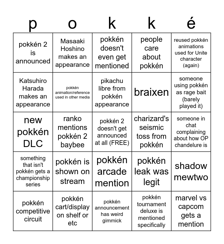 This bingo card has a free space and 24 words: pokkén is shown on stream, pokkén cart/display on shelf or etc, pikachu libre from pokkén appearance, pokkén competitive circuit, reused pokkén animations used for Unite character (again), pokkén 2 is announced, Katsuhiro Harada makes an appearance, Masaaki Hoshino makes an appearance, charizard's seismic toss from pokkén, pokkén arcade mention, braixen, new pokkén DLC, pokkén leak was legit, shadow mewtwo, pokkén animation/reference used in other media, pokkén tournament deluxe is mentioned specifically, someone in chat complaining about how OP chandelure is, pokkén doesn't even get mentioned, someone using pokkén as rage bait (barely played it), ranko mentions pokkén 2 baybee, marvel vs capcom gets a mention, something that isn't pokkén gets a championship series, people care about pokkén and pokkén announcement has weird gimmick.
