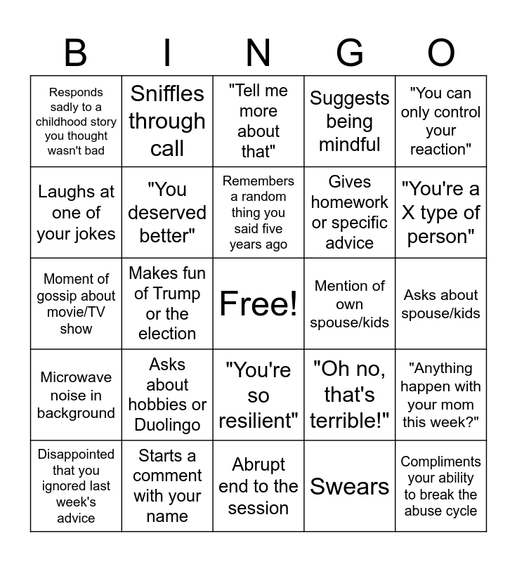 This bingo card has a free space and 26 words: "You're so resilient", Swears, Remembers a random thing you said five years ago, Starts a comment with your name, "You can only control your reaction", Responds sadly to a childhood story you thought wasn't bad, Laughs at one of your jokes, Sniffles through call, Asks about spouse/kids, "Oh no, that's terrible!", Gives homework or specific advice, Moment of gossip about movie/TV show, "Anything happen with your mom this week?", Disappointed that you ignored last week's advice, Makes fun of Trump or the election, Can't remember zip code for Square, Suggests being mindful, Microwave noise in background, "Tell me more about that", Compliments your ability to break the abuse cycle, "You're a X type of person", Abrupt end to the session, Mention of own spouse/kids, Asks about hobbies or Duolingo, "You deserved better" and "Is that helpful?".