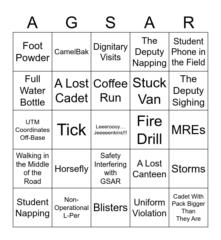 This bingo card has a free space and 51 words: Chigger Pox, Cadet With Pack Bigger Than They Are, Reference to “The List”, Blisters, Horsefly, Safety 1 Being Safety, CamelBak, Super Troopers Reference, Full Water Bottle, Z Napping, A Lost Cadet, The Deputy Napping, Storms, A Lost Canteen, Tornado Warning, White Light at Night, Coffee Run, Fire Drill, Glow Stick Party, Student Phone in the Field, Tick, Uniform Violation, Foot Powder, Stuck Van, Deer, Mittens the Murder Kitty, The Deputy Sighing, Staff Napping, Student Napping, Dignitary Visits, Range Control Radio Check, Range Control Visit, NESA Mingle.com, MAS Obstructing GSAR, Dead Radio Battery, Non-Operational L-Per, Rain Dancing, Peterson’s Crocs, Turtle, Snake, MREs, Walking in the Middle of the Road, Malicious Compliance, Comm Being Comm, Bedsheet Toenail Remover, 100% DEET to the Face, UTM Coordinates Off-Base, Commandant Saying, “Whaaaat?”, Commandant Saying, “Guy.”, Safety Interfering with GSAR and GSAR “Liberating” Stuff.
