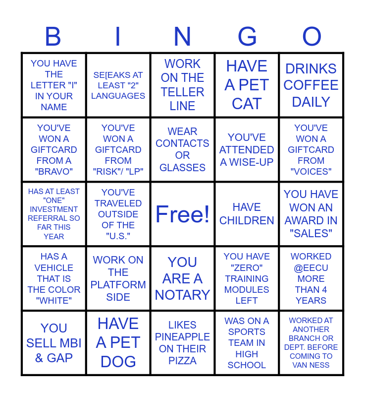 This bingo card has a free space and 24 words: WORK ON THE PLATFORM SIDE, HAVE A PET DOG, WEAR CONTACTS OR GLASSES, YOU SELL MBI & GAP, DRINKS COFFEE DAILY, YOU HAVE THE LETTER "I" IN YOUR NAME, YOU'VE WON A GIFTCARD FROM A "BRAVO", SE[EAKS AT LEAST "2" LANGUAGES, HAVE CHILDREN, YOU ARE A NOTARY, YOU'VE ATTENDED A WISE-UP, HAS AT LEAST "ONE" INVESTMENT REFERRAL SO FAR THIS YEAR, YOU HAVE "ZERO" TRAINING MODULES LEFT, WORKED @EECU MORE THAN 4 YEARS, YOU'VE WON A GIFTCARD FROM "RISK"/ "LP", WAS ON A SPORTS TEAM IN HIGH SCHOOL, YOU HAVE WON AN AWARD IN "SALES", WORK ON THE TELLER LINE, YOU'VE WON A GIFTCARD FROM "VOICES", YOU'VE TRAVELED OUTSIDE OF THE "U.S.", WORKED AT ANOTHER BRANCH OR DEPT. BEFORE COMING TO VAN NESS, HAS A VEHICLE THAT IS THE COLOR "WHITE", HAVE A PET CAT and LIKES PINEAPPLE ON THEIR PIZZA.