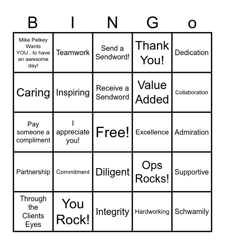This bingo card has a free space and 24 words: Commitment, You Rock!, Receive a Sendword, Through the Clients Eyes, Dedication, Mike Pelkey Wants YOU...to have an awesome day!, Caring, Teamwork, Excellence, Diligent, Value Added, Pay someone a compliment, Ops Rocks!, Supportive, Inspiring, Hardworking, Admiration, Send a Sendword!, Collaboration, I appreciate you!, Schwamily, Partnership, Thank You! and Integrity.