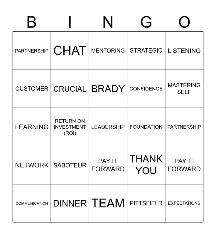 This bingo card has 151 words: Free!, ADVISORY GROUP, ALIGNMENT, BAG, BRADY, BUILDING, BUSINESS, CAPSTONE, CHANGE, CHAT, COHORT, COMMUNICATION, CONFIDENCE, CONVERSATION, CRUCIAL, CUSTOMER, DEATHSTAR, DECISION(S), DEVELOP, DINNER, DIVERSE, DRESS, EFFECTIVE, ELT, EMOTIONAL INTELLIGENCE, ENGAGE, EXPECTATIONS, FOUNDATION, GDMS, GOAL(S), GRADUATION, INFLUENCE, INVESTMENT, IT, JOURNEY, KICKOFF, LEAD, LEADER, LEADERSHIP, LEADERSHIP 360, LEARNING, LINE OF BUSINESS, LISTENING, MANAGER, MASTERING SELF, MENTORING, MSLP, NEGOTIATION, NETWORK, NUTS, OPEN, PARTNERSHIP, PAY IT FORWARD, PEOPLE, PERCEPTION, PITTSFIELD, PMLP, POWERPOINT, PRESENTATION, REFLECT(ION), RETURN ON INVESTMENT (ROI), RISKS, SABOTEUR, SELF, SELF-AWARENESS, SITUATIONAL, STRATEGIC, SUCCESS, TARGET, TASK, TEAM, THANK YOU, TIER, TIME, TOOLS, TRAINING, ADVISORY GROUP, ALIGNMENT, BAG, BRADY, BUILDING, BUSINESS, CAPSTONE, CHANGE, CHAT, COHORT, COMMUNICATION, CONFIDENCE, CONVERSATION, CRUCIAL, CUSTOMER, DEATHSTAR, DECISION(S), DEVELOP, DINNER, DIVERSE, DRESS, EFFECTIVE, ELT, EMOTIONAL INTELLIGENCE, ENGAGE, EXPECTATIONS, FOUNDATION, GDMS, GOAL(S), GRADUATION, INFLUENCE, INVESTMENT, IT, JOURNEY, KICKOFF, LEAD, LEADER, LEADERSHIP, LEADERSHIP 360, LEARNING, LINE OF BUSINESS, LISTENING, MANAGER, MASTERING SELF, MENTORING, MSLP, NEGOTIATION, NETWORK, NUTS, OPEN, PARTNERSHIP, PAY IT FORWARD, PEOPLE, PERCEPTION, PITTSFIELD, PMLP, POWERPOINT, PRESENTATION, REFLECT(ION), RETURN ON INVESTMENT (ROI), RISKS, SABOTEUR, SELF, SELF-AWARENESS, SITUATIONAL, STRATEGIC, SUCCESS, TARGET, TASK, TEAM, THANK YOU, TIER, TIME, TOOLS and TRAINING.