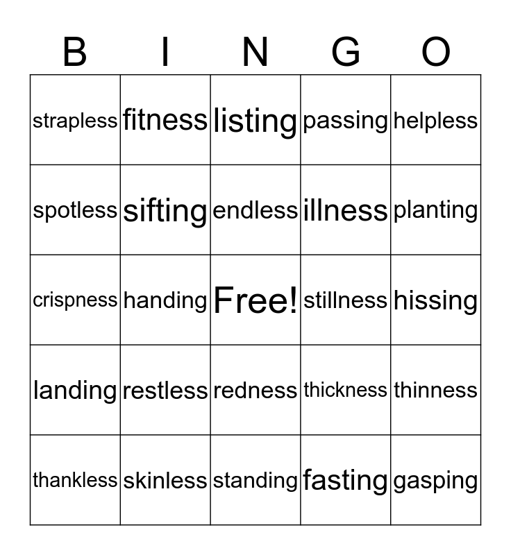 This bingo card has a free space and 24 words: restless, skinless, endless, thankless, helpless, strapless, spotless, fitness, stillness, redness, illness, crispness, thickness, thinness, sifting, fasting, hissing, listing, planting, handing, gasping, landing, passing and standing.