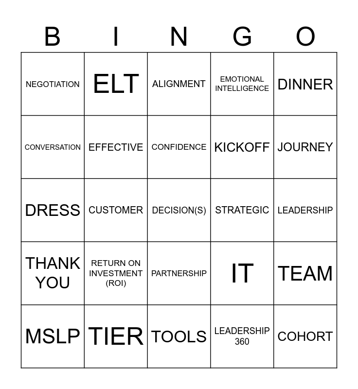 This bingo card has 76 words: Free!, ADVISORY GROUP, ALIGNMENT, BAG, BRADY, BUILDING, BUSINESS, CAPSTONE, CHANGE, CHAT, COHORT, COMMUNICATION, CONFIDENCE, CONVERSATION, CRUCIAL, CUSTOMER, DEATHSTAR, DECISION(S), DEVELOP, DINNER, DIVERSE, DRESS, EFFECTIVE, ELT, EMOTIONAL INTELLIGENCE, ENGAGE, EXPECTATIONS, FOUNDATION, GDMS, GOAL(S), GRADUATION, INFLUENCE, INVESTMENT, IT, JOURNEY, KICKOFF, LEAD, LEADER, LEADERSHIP, LEADERSHIP 360, LEARNING, LINE OF BUSINESS, LISTENING, MANAGER, MASTERING SELF, MENTORING, MSLP, NEGOTIATION, NETWORK, NUTS, OPEN, PARTNERSHIP, PAY IT FORWARD, PEOPLE, PERCEPTION, PITTSFIELD, PMLP, POWERPOINT, PRESENTATION, REFLECT(ION), RETURN ON INVESTMENT (ROI), RISKS, SABOTEUR, SELF, SELF-AWARENESS, SITUATIONAL, STRATEGIC, SUCCESS, TARGET, TASK, TEAM, THANK YOU, TIER, TIME, TOOLS and TRAINING.