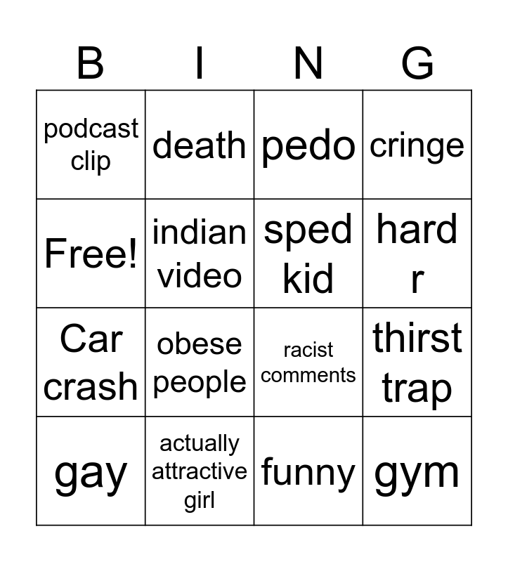This bingo card has 16 words: actually attractive girl, thirst trap, pedo, podcast clip, Car crash, death, racist comments, funny, Free!, indian video, gay, cringe, obese people, hard r, sped kid and gym.