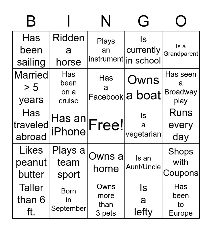 This bingo card has a free space and 28 words: Shops with Coupons, Likes to go camping, Owns a boat, Is a lefty, Married > 5 years, Plays an instrument, Ridden a horse, Likes peanut butter, Is a vegetarian, Taller than 6 ft., Has traveled abroad, Is currently in school, Born in September, Owns more than 3 pets, Has seen a Broadway play, Has post-grad education, Plays a team sport, Has been on a cruise, Has a Facebook, Owns a home, Has been sailing, Has a gym membership, Has been to Europe, Has an iPhone, Runs every day, Is an Aunt/Uncle, Is a Grandparent and Volunteers.