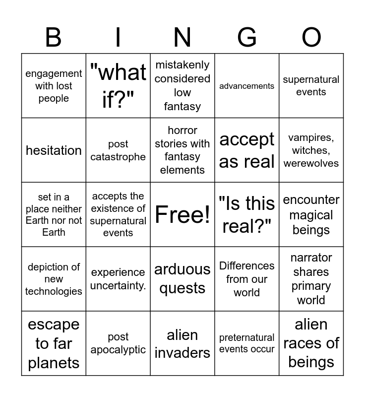 This bingo card has a free space and 24 words: experience uncertainty., post apocalyptic, horror stories with fantasy elements, escape to far planets, supernatural events, engagement with lost people, hesitation, "what if?", "Is this real?", arduous quests, accept as real, set in a place neither Earth nor not Earth, Differences from our world, narrator shares primary world, post catastrophe, preternatural events occur, encounter magical beings, mistakenly considered low fantasy, vampires, witches, werewolves, accepts the existence of supernatural events, alien races of beings, depiction of new technologies, advancements and alien invaders.
