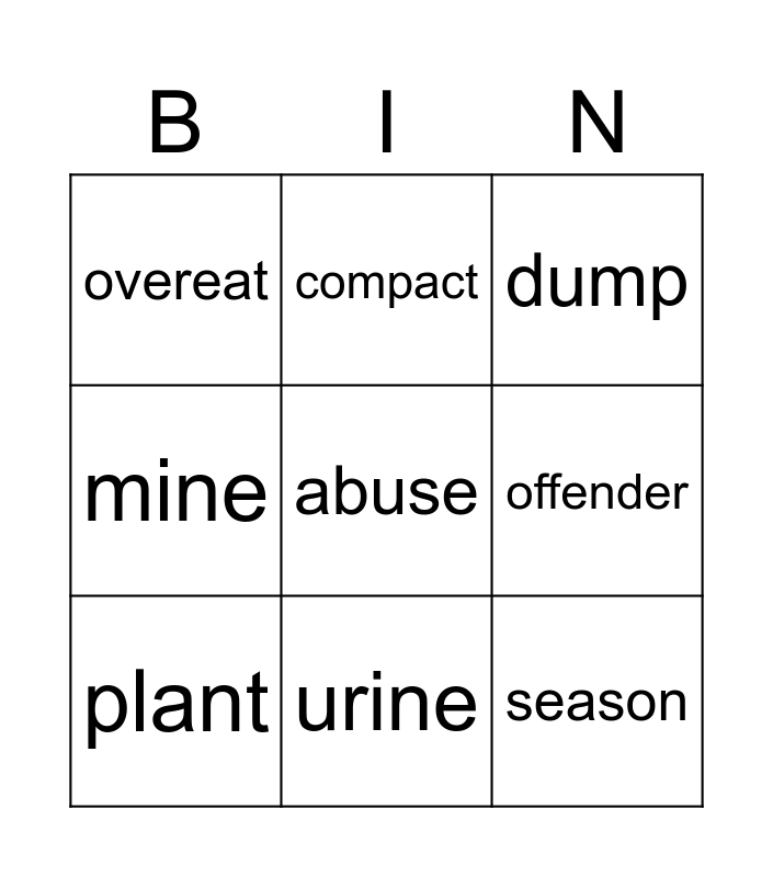 This bingo card has 33 words: seed, kick, bind, valid, interest, plant, abuse, divorce, compact, date, urine, dump, glasses, factory, pray, harvest, angle, snarl, marathon, magazine, electronics, iron, overeat, close, economics, monk, mine, season, offender, night, update, auction and corn.