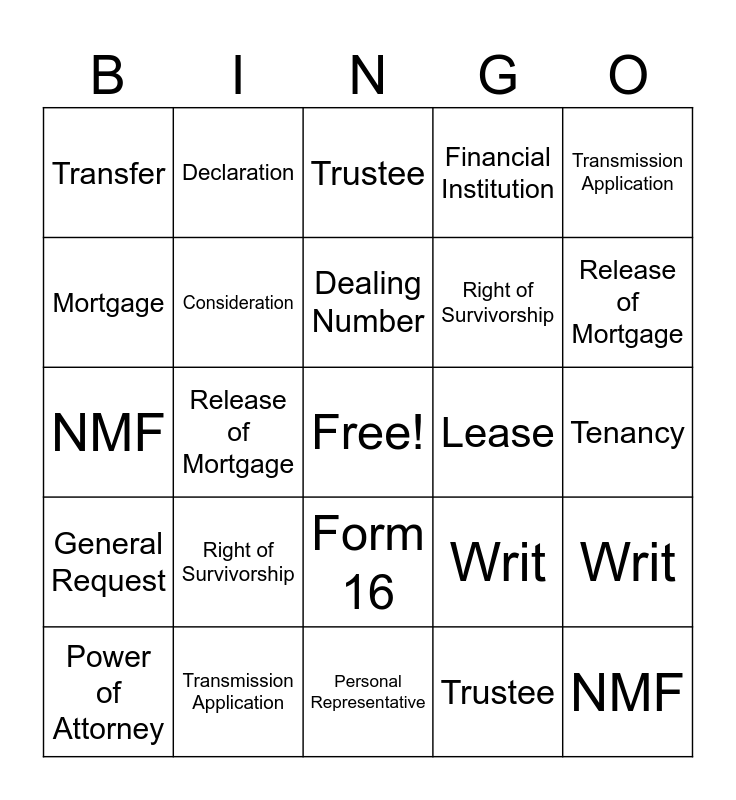 This bingo card has a free space and 56 words: Form 3, Power of Attorney, Title Search, Transfer, Personal Representative, Record of Death, Consideration, Witnessed, Right of Survivorship, Easement, Financial Institution, General Request, Tenancy, Form 16, Form 24 Property Information, Mortgage, Transmission Application, Release of Mortgage, Joint Tenants, NMF, Lease, Certified, Writ, Trustee, Caveat, Dealing Number, Form 3, Mortgagee, Release of Mortgage, Dealing number, Transfer, Form 1, Consideration, Witnessed, Tenancy, Mortgage, NMF, Financial Institution, General Request, Declaration, Form 16, Power of Attorney, Certified, Joint Tenants, Record of Death, Right of Survivorship, Transmission Application, Personal Representative, An Original Will, Title Search, Trustee, Form 24 Property Information, Lease, Easement, Writ and Caveat.
