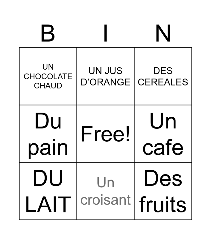 This bingo card has a free space and 8 words: Un cafe, DES CEREALES, UN JUS D’ORANGE, DU LAIT, UN CHOCOLATE CHAUD, Des fruits, Du pain and Un croisant.